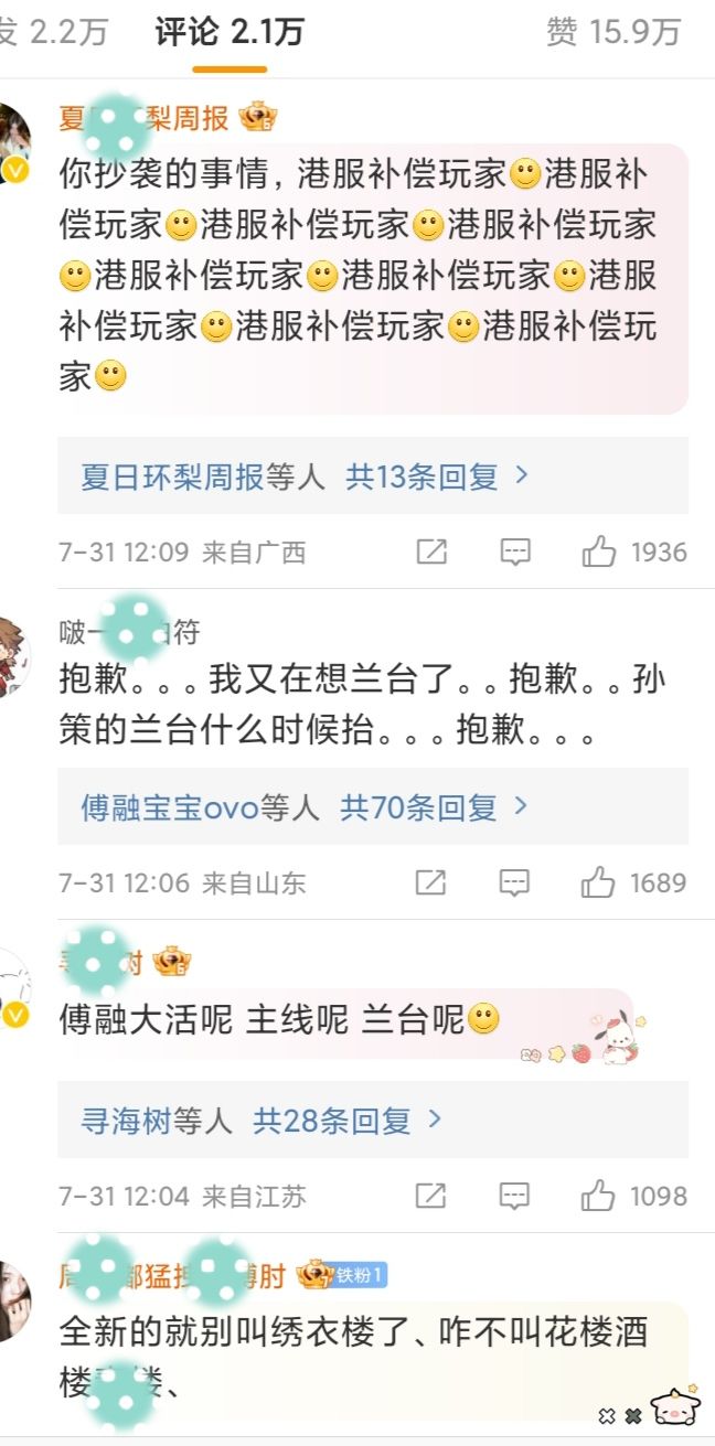 插播一条手游资讯。最近手游《代号鸢》“删除女性向标签、玩低俗烂梗”登上热搜,遭玩家抵制。部分玩家涌入其国服版《如鸢》的官方微博评论区,留言称已“卸载游戏、注销账号、停止氪金”。对于文案问题,《如鸢》研发和运营方灵犀互娱方面则是回应称,“网传争议文案从未在《如鸢》中出现过。《如鸢》和《代号鸢》是两款独立运营的游戏,《如鸢》由灵犀互娱研发和运营,我们一直很重视玩家的体验和反馈。而国际版《代号鸢》的
