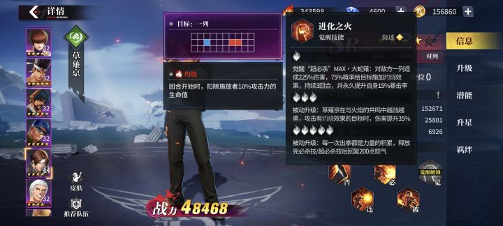#kof新篇测试 #代号97 从目前角色来看,最强阵容全部围绕八神组建,特别是觉醒后的八神,超必杀锁定血量最低,收割几率再次释放,自身免控吸血无视防御由此有两套阵容推荐八神莉安娜后排秒杀,搭配克里斯金,1号位站个防御即可八神特瑞大招流,陪罗伯特加暴击,坂崎良一拳超人,特推本身伤害也非常离谱,暴击直接融化2个其他队伍火队的镇元斋觉醒后伤害也非常夸张第二天的大蛇经过调整目前看起来也是竞技场