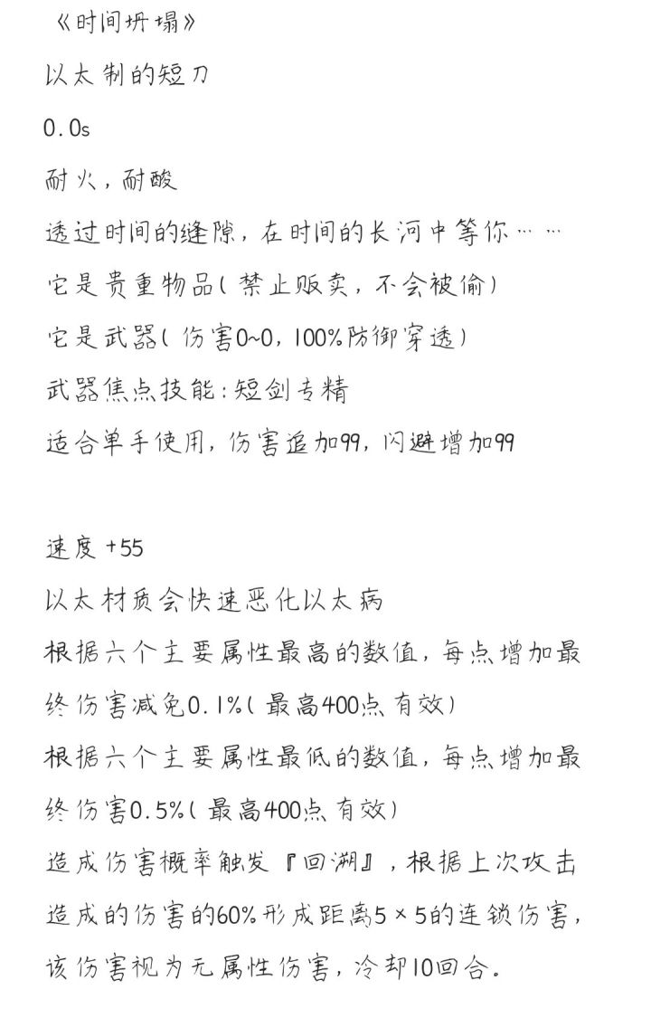 ##以太杯 手持 战术+50 魔法修行+50 射术+50 主动施放冰冻射线有几率对目标施加buff超导现象 超导现象 :使目标雷电耐性降低80%,持续一回合,当目标存在超导现象时被炙热射线击中触发热震 热震 :极速的冷热冲击使目标从内部碎裂,物理防御归零持续10回合 传奇工匠盖洛克用这个笔记本来记载自己锻造生涯中发明的工艺