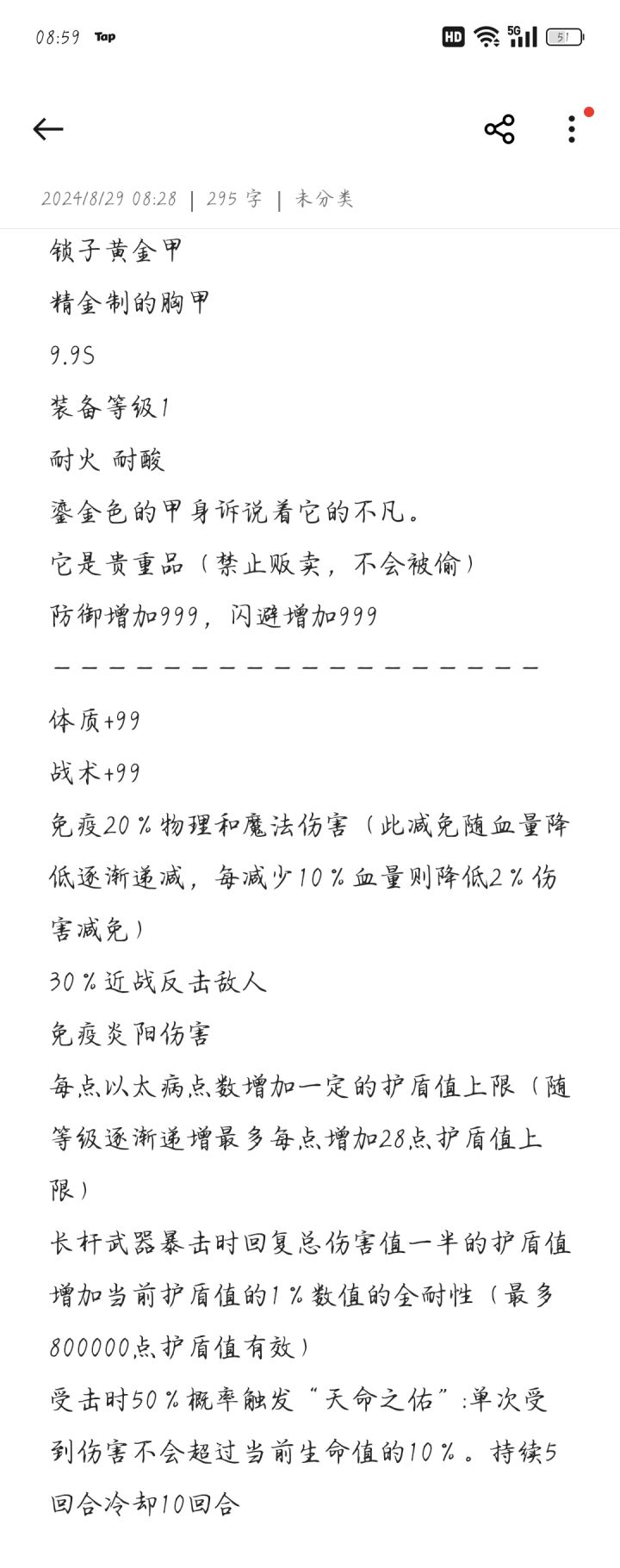 《锁子黄金甲》黄金制的胸甲7.3s装备等级 1耐火 耐酸水火难侵,刀枪不入它是贵重品(禁止贩卖,不会被偷)防御增加236,闪避增加56力量+3「重装备」+30命中20%获得冲锋祝福冲锋祝福上限+2体质+99全耐性+999暴击时,20%触发【斗战胜佛】,免疫负面魔法,周围八格内每有一名敌人,获得临时的10%的生命值上限,至多获得66%的生命值上限,持续50回合,冷却50回