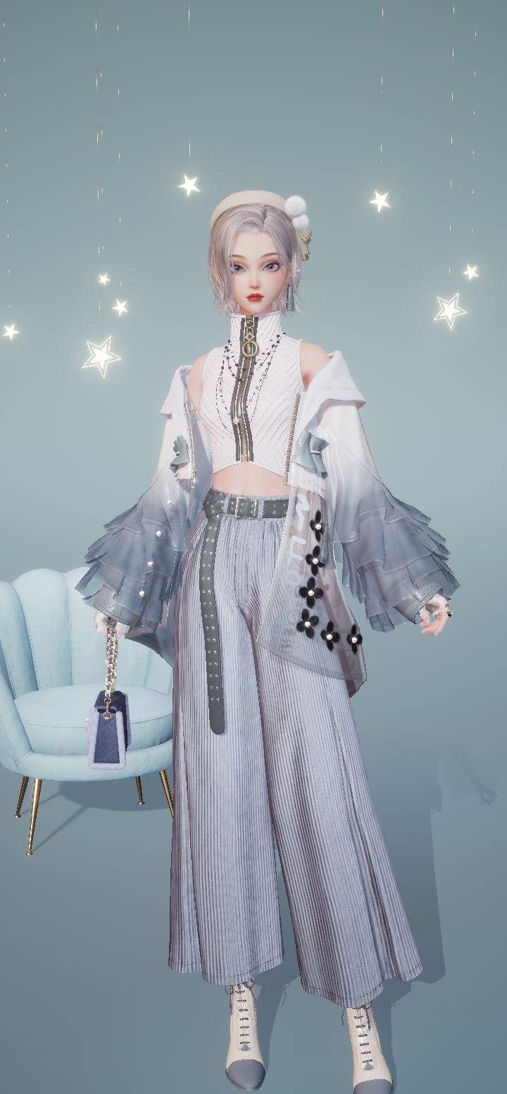 是按外套的颜色搭配的,对蓝灰没什么感觉,只是单纯没有外套那个套装的色卡ヽ(・_・;)ノ真的好喜欢那个无袖上衣,不过不染纯白就会感觉脏脏的,不好看,唔今天也是帅帅的女鹅呢~#以闪耀之名#游戏日常