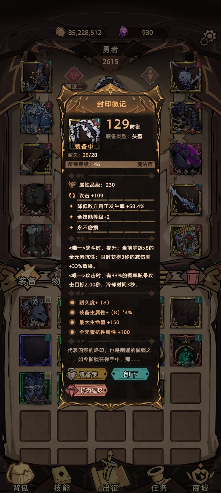 游戏上线已经将近一个月了,贴吧里面还没有一个系统的装备界面解释和制作装备时选取哪个锁定词条毕业的几率更大一点,这个帖子将对上述问题进行解决。装备界面整个装备界面我个人将其分为了11个部分,接下来对各个部分进行解释:①装备主属性,除了饰品和头盔,其他部位的主属性都是固定的。胸甲、腿甲的主属性为防御;护臂、鞋子的主属性为生命;主手的主属性为攻击;盾的主属性为防御;魔法书的主属性为攻击;