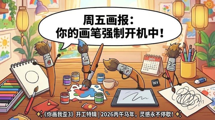 各位画友好!过完春节回来的第一个周五,我们准时出现啦~🧧这个春节,你是吃吃喝喝、走亲访友,还是偷偷画了几笔?节后第一周,你的“绘画状态”恢复得怎么样了?🖌️ 【本周话题:节后第一画】欢迎来聊聊你的节后“第一幅画”——可以是:春节里随手涂的灯笼/饺子/红包返工返校后画的“不想上班/上学”表情包或者……你其实还没拿起画笔?(没事,我们也刚缓过来😂)A. 已经画了,画的是______B