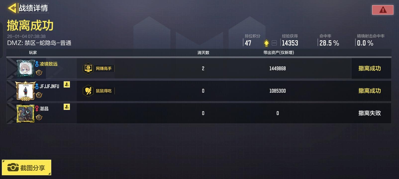 不敢去困难局,最近几天一进困难刚走几步路直接迎面碰上一队人,野排的队友直接被团灭,特意隔了两天再玩普通局,第一把跟着俩队友一路捡垃圾,顺手还漏了个红给我第二把三号太惨了,船那边的撤离点有一个人了,非要卡在最后三秒冲下去,结果直接就没了,我都还没反应过来,之后含泪把它包给舔了,之前二号被锤倒了不知道为啥没退,刚好去把它救回来,结果后面他没赶上我叫的撤离飞机