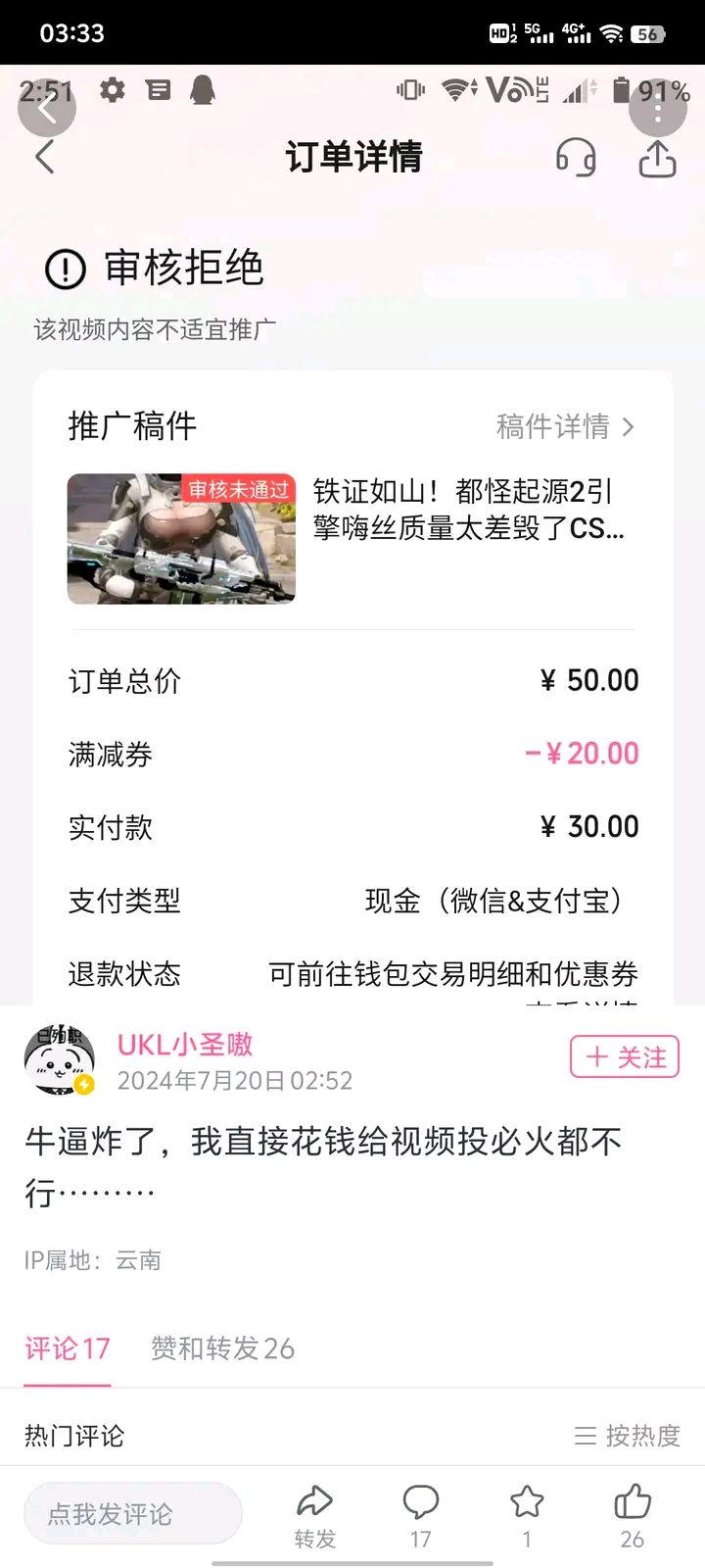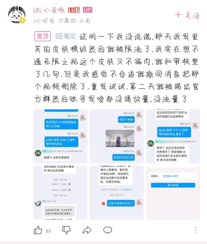 11万粉的b站upUKL小圣嗷于2024年7月18日做了外芙的CS2mod,按正常情况下来说,这种视频至少能混到到5万-20播放量。但在做出来之后他发现视频却直接被限流了,去官方群里面申诉,结果被踢出群。他又想私聊管理,结果被拉黑。最后只能在视频下面自曝自己被踢的悲惨经历。目前为止视频只有5000播放量,但却有1644点赞,364条评论,1508投币。而他以前5万播放量的视频,却只有