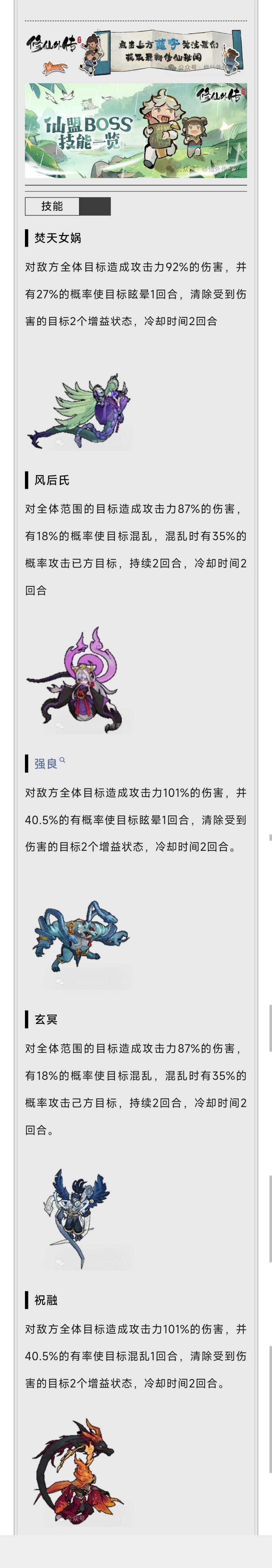 仙盟玩法攻略-仙盟试炼篇#修仙外传仙盟攻略#修仙外传兑换码 #修仙外传仙盟 每日的墨韵幻境boss每天必打,是我们攒仙盟币的好途径,下面是墨韵boss信息,看第一张图片。其中就强良最难打,需要多带刀系武器,单体爆发高才好过,否则有三回合必死buff。其他boss没啥讲的,很好过。#修仙外传仙盟攻略 然后是幻域伏魔的公会boss,这个萌新混点伤害就行,每周也有奖励拿。差不多就这些。萌