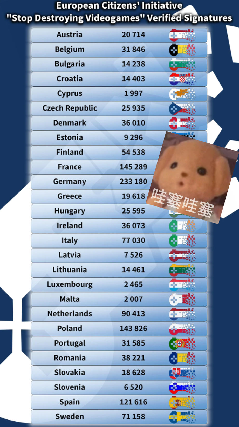 2026年1月,欧洲公民发起的“停止毁灭游戏”请愿经欧盟正式审核,确认获得1294188个有效签名,远超推进该倡议所需的100万签名最低要求,该请愿即将正式成为欧盟议题,交接仪式预计于2026年2月中下旬举行。本次请愿总计发起1448270个签名,最终有效签名数达1294188个,签名无效率仅约10%,远高于欧盟推进公民请愿的100万签名门槛。该请愿的签名地域分布中德国数量位居首位,法国和波兰的
