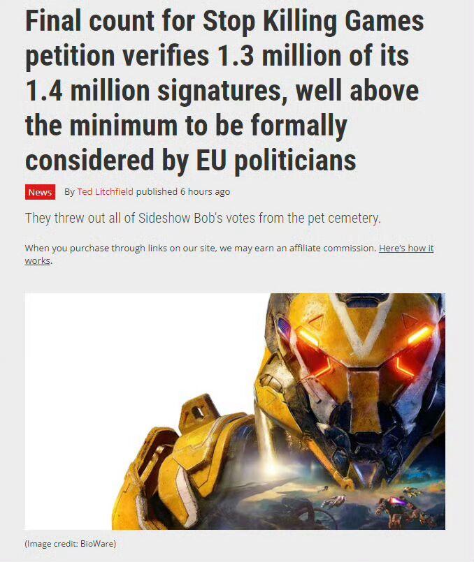 大的出现啦家人们!最近一项名为“Stop Killing Games(译为停止毁灭游戏)”的玩家倡议运动,又又引发了大伙的热议。据悉这项欧洲公民倡议已经收集了超过130万份经过核实的有效签名,远远超过了欧盟规定的100万门槛,这意味着欧盟委员会必须正式审议这份提案了,未来咱们或许能看到相关法案出台。这项倡议的核心诉求很有意思,人话翻译就是玩家花钱买了游戏,不应该在服务器关闭后就完全没法玩了。还