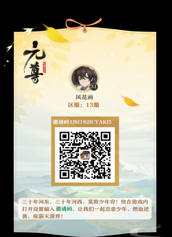 三十年河东,三十年河西,莫欺少年穷!我是13服区的风花画,我的邀请码是2J8A1922TYAS25,快在游戏内打开设置输入邀请码,让我们一起恣意少年,燃血逆袭,称霸天源界!#游戏种草计划#游戏安利#游戏推荐#元尊手游#福利活动#攻略