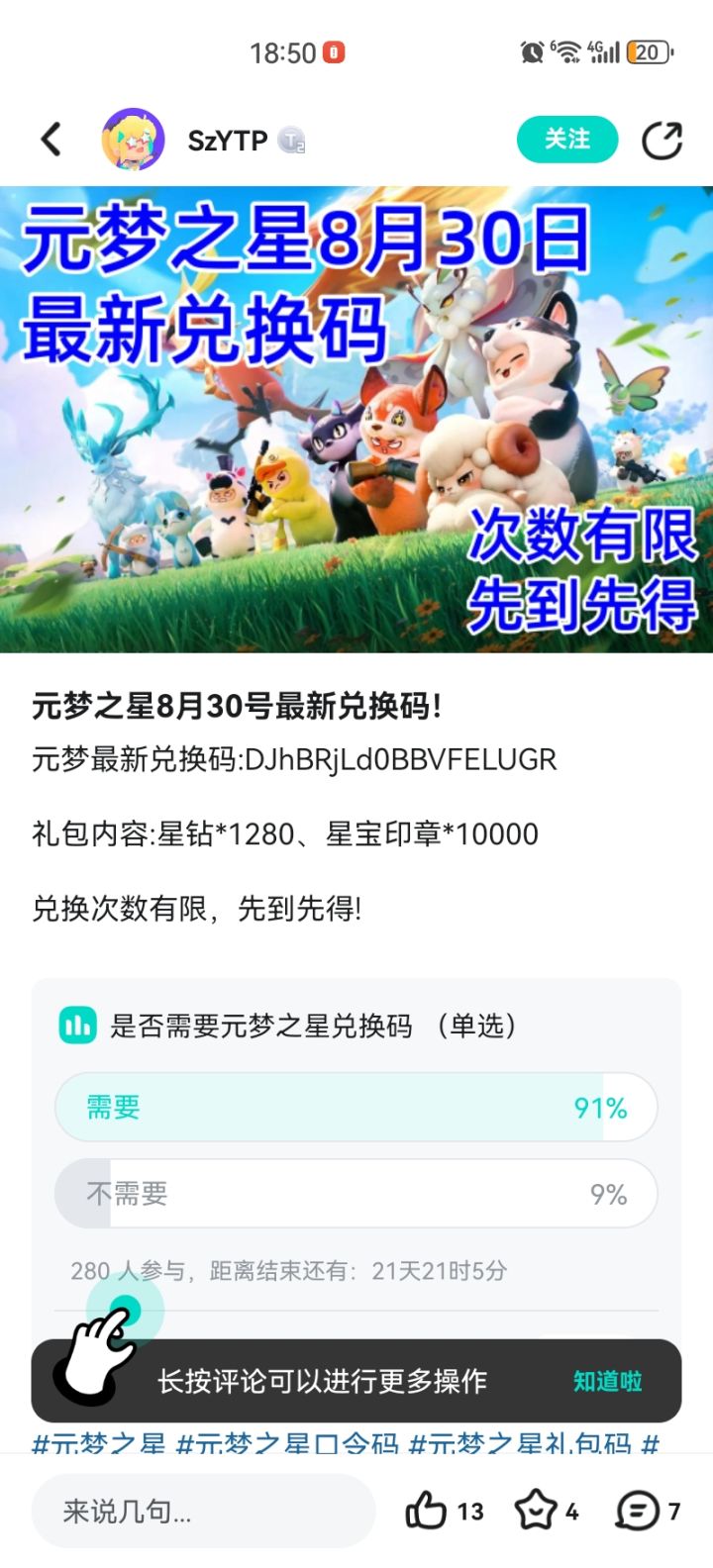 口令码1:元梦首发狂欢口令码2:星宝的好朋友口令码3:上抖音看元梦口令码4:抖音星宝们冲口令码5:抖音星梦合伙人口令码6:大仙688口令码7:一起元梦吧口令码8:薯星星的好朋友口令码9:元梦搭子请上车#元梦之星同人征集#元梦之星#口令码#分享#兑换码