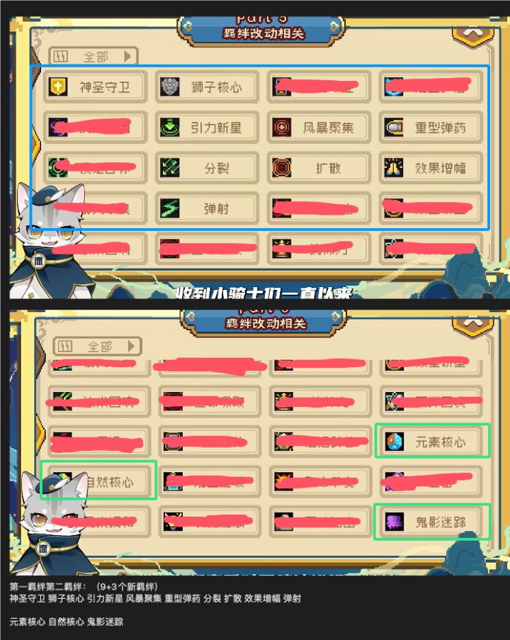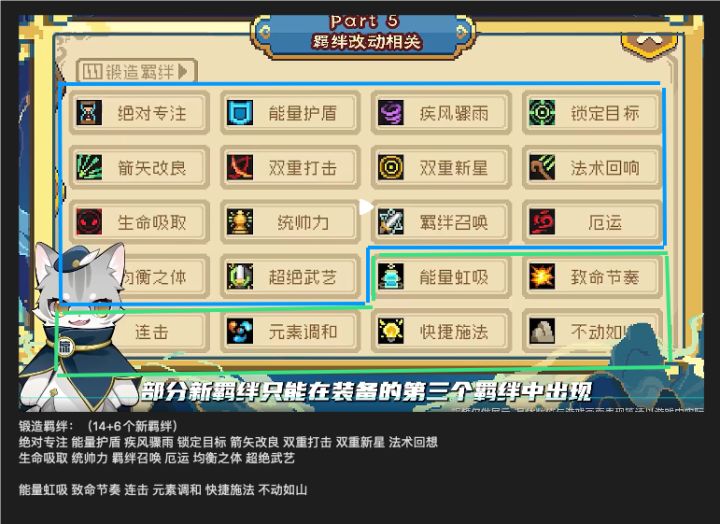没截错图的话,第一第二羁绊总共12个(9个老羁绊+3个新羁绊)老羁绊:神圣守卫 狮子核心 引力新星 风暴聚集 重型弹药 分裂 扩散 效果增幅 弹射 新羁绊:元素核心 自然核心 鬼影迷踪需要锻造才能有概率获得或者氪得的第三羁绊总共20个(14个老羁绊+6个新羁绊)老羁绊:绝对专注 能量护盾 疾风骤雨 锁定目标 箭矢改良 双重打击 双重新星 法术回想 生命吸取 统帅力 羁绊召唤 厄运 均衡之