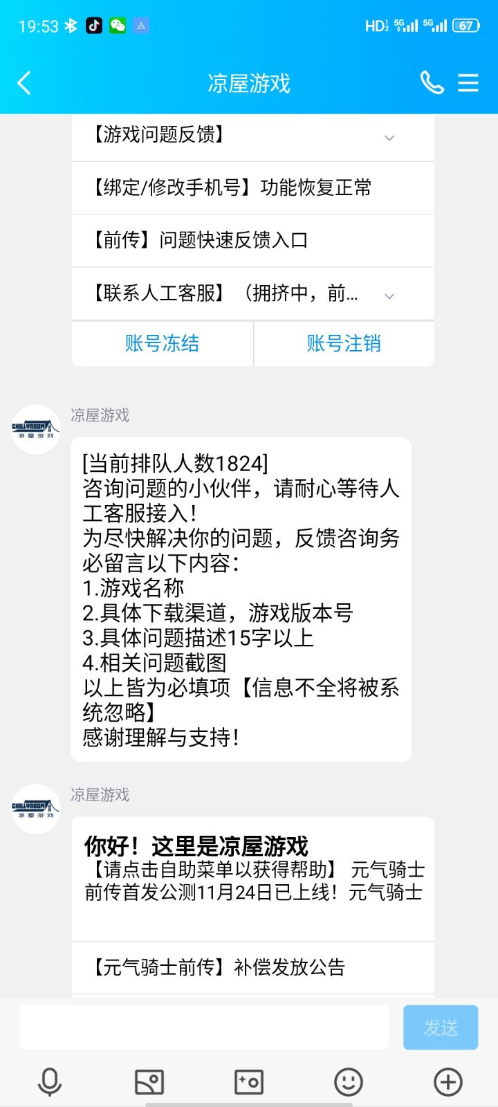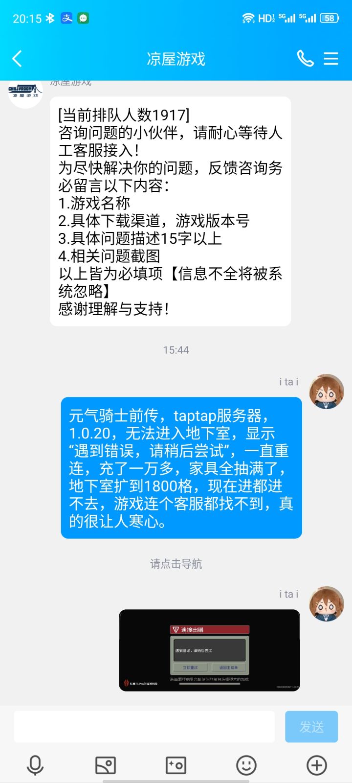 元气骑士前传,无法进入地下室,显示“遇到错误,请稍后尝试”,一直重连,充了一万多,家具全抽满了,地下室扩到1800格,现在进都进不去,游戏连个客服都找不到,12月13号听主播说把一个系列的家具抽全可以换地下室主题,当晚补全所有系列装饰,第二天就显示无法进入了,今天第三天还是进不去,问了身边朋友只有我出现了这个问题,bug反馈提交了也没有任何回复,人工客服没有电话,只能在QQ平台排队,到现在联系不上