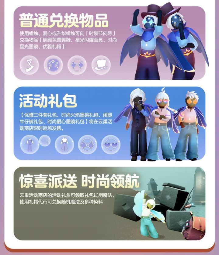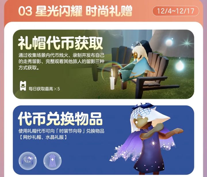 2025光遇时尚日它来了!坏消息:今年0新物品,策划属实有点水;好消息:老玩家直接躺赢!萌新别慌,速抄复刻攻略👇 🎩 一、时尚日物品:全是复刻! 和去年一模一样,还是 2件代币物品 + 1个组合礼包。钱包和蜡烛都省了! 1. 代币兑换(礼帽代币): - 网纱礼帽 - 水晶礼服 获取方式:挂机! 向导旁边蹲着收烛火合成,一天最多5个,挂满约5分钟⏳(不同节日代币获取方式可能不同哦)。#云手机