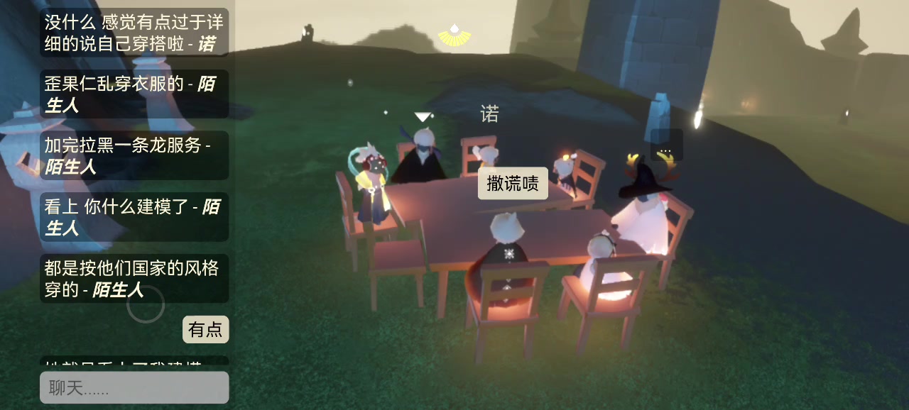 我也是玩了很久的光遇了,安官刚开服就开始玩了,中间断断续续也玩了很久,我之前也没怎么碰到过迷惑人,今天就突然碰到了俩。不要太迷惑好吗,我今天在墓土玩的好好的,就正常和我朋友在聊天,然后来了两个白鸟,就是图里面这个白鸟,然后就是一直用姆明季帐篷在盖我们,因为被盖了很多次,一直被盖,我就问号他们,还一直就是拿动作恶心我们,我就上桌问他们是不是有病,被举报禁言了,还说我是不是破防了,怎么不打字,说我乐