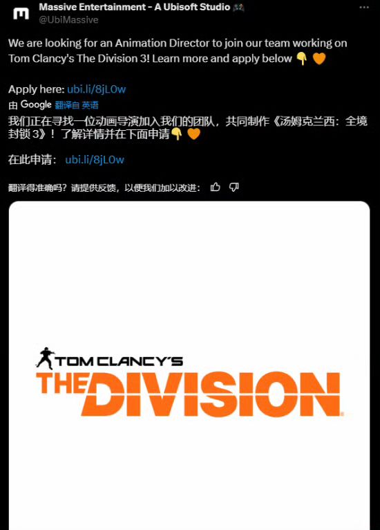 9/7号,《全境封锁》系列的制作组Ubisoft Massive 发文称,招一位动画导演,制作《全境封锁3》❗❗❗看这个招聘信息,有点拉屎才挖坑的感觉据悉,Massive 制作组的最新作品《星球大战:亡命之徒》,已经在8/30上线啦这是一点都不休息呀,又直接开新坑了!不知道大家怎么看?