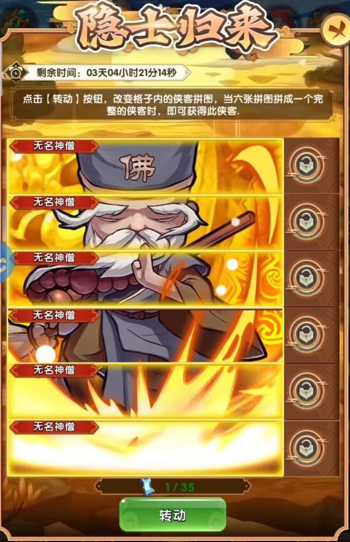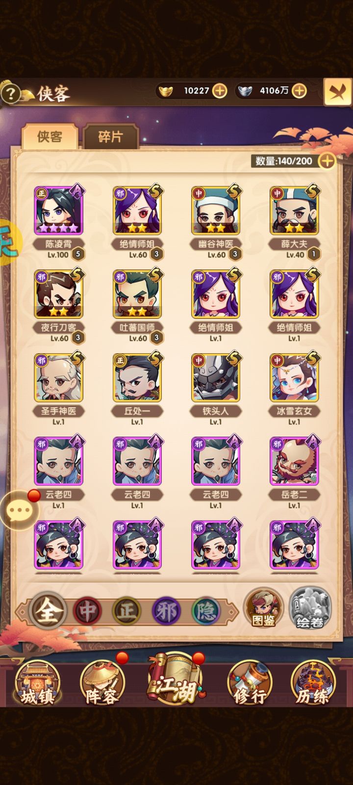 本帖纯干货,谈侠客养成,先来一张镇贴图吧!很多人都会问,先练哪个侠客好?隐侠客练的顺序是什么?哪些侠客有用?看下文给你想要的答案!⭐️首先说一点,没有万能阵容,不同场景,不同阵容!!!金卡尽量不要吃,狗粮用紫卡升到金卡再吃!!!银币不够,突破石不够,经验不够都是对的,发展越快,越不够!!!⭐️开局(指的是第一天)v6以下,前四天全紫卡冲榜,能冲多高冲多高,长期玩的话,争取高排名很有必要!完全