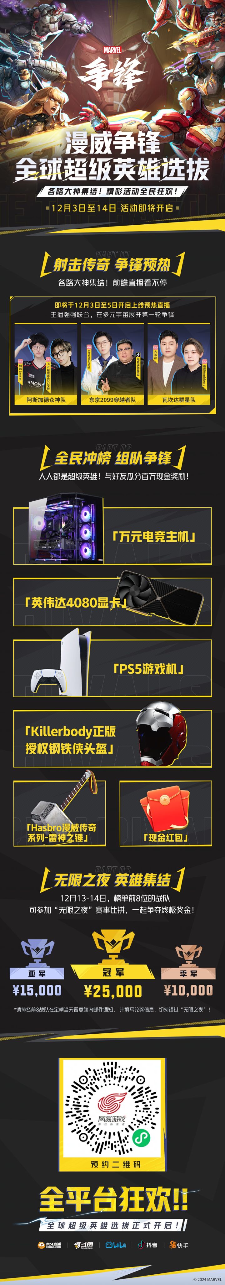 《漫威争锋》#全球超级英雄选拔 正式开启 ,全平台孰与争锋!🎯 射击传奇,高燃争锋——战队大神集结,精彩直播看不停!🏆 全民爬榜,组队争锋——与好友组建超级战队,瓜分百万现金奖励!🎁 英雄试炼,豪礼争锋——主机、显卡、PS5、漫威周边手办等你领取! 更多细则,可点击下方长图查看。具体参与方式,敬请关注《漫威争锋》各大官方账号!即刻前往官网预约公测,12月6日化身超级英雄,与全球玩