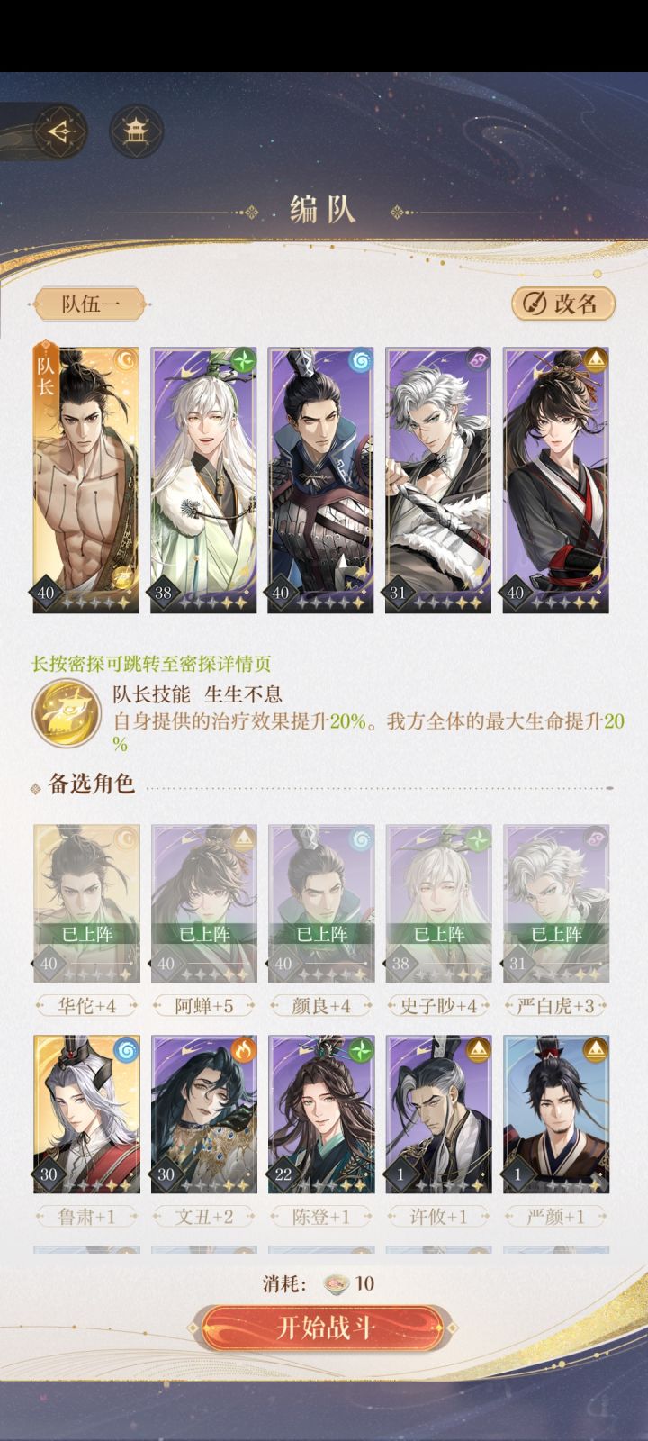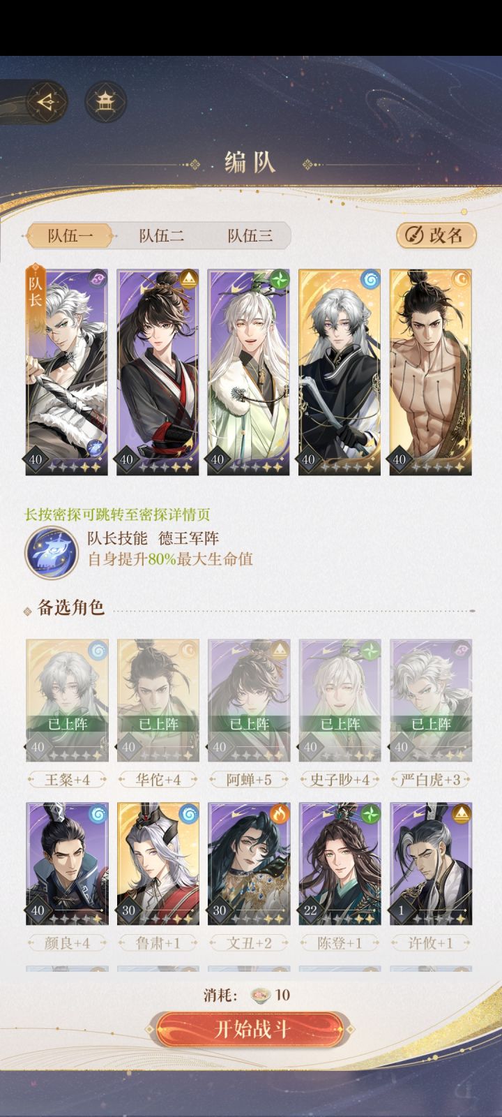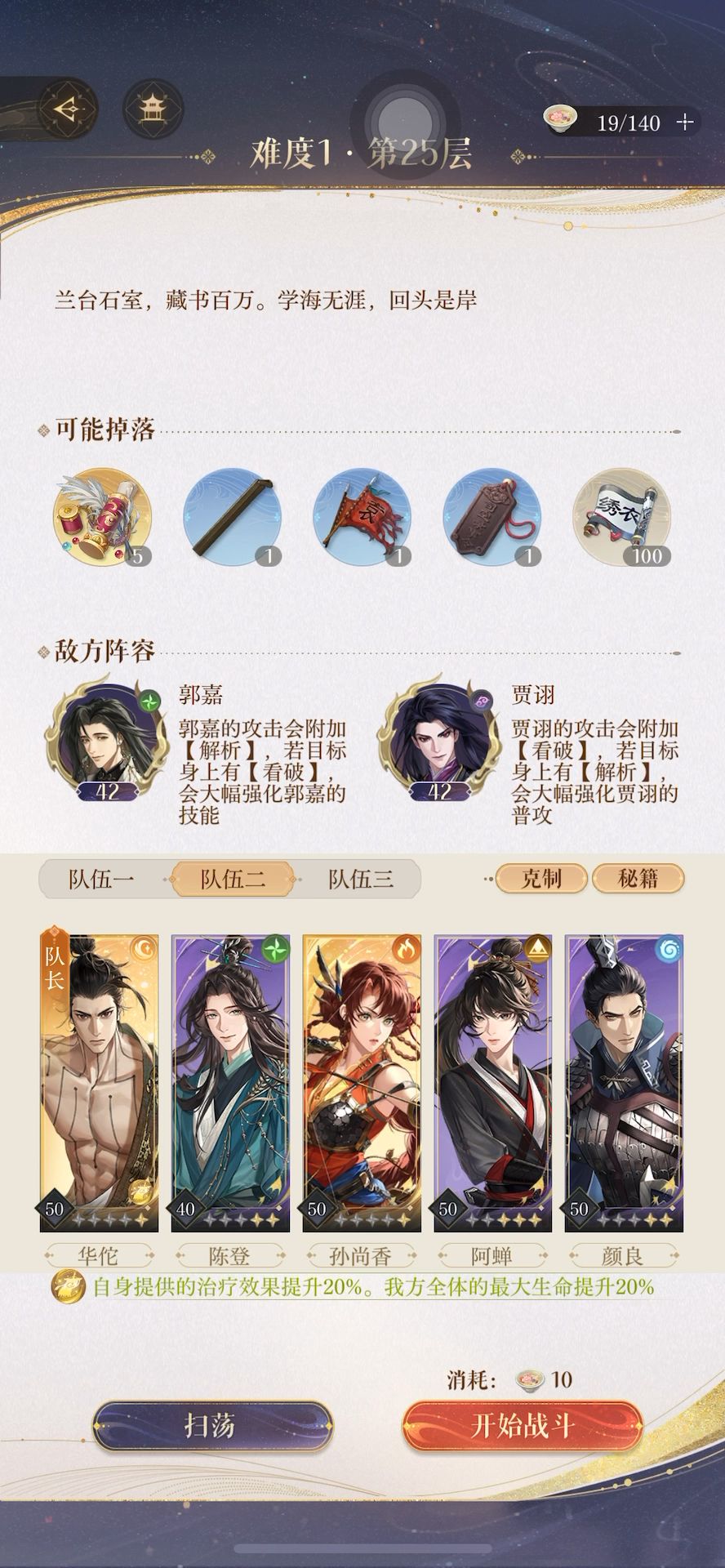 🌟思路:两c➕一盾➕一奶➕打火机陈登,防御不够的话再上个盾或者奶妈) 华佗50➕7 陈登40➕5 香香50➕6 阿蝉50➕7 颜良50➕5 1️⃣队伍里一定要有个盾,例如颜良,用于扛伤,不然贾诩伤害转移很痛。打贾诩时每回合颜良第一个普攻,赌抗贾诩的伤害转移,有几率失败。 2️⃣控制郭嘉和贾诩的血量,血量差不多时一波带走。也可以先带走贾诩,再带走郭嘉。 3️⃣队伍里有个纯奶妈压力会小一点,狮子喵还没