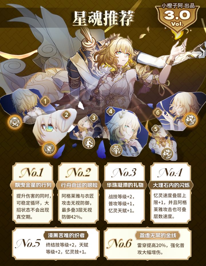 UID:104802274哈喽喽,这里是小橙子阿,本期是阿格莱雅的角色攻略!本篇将用图文形式讲解阿格莱雅的技能机制、光锥选择、星魂解析、遗器以及队伍搭配。你我的命运,由此交织。 阿格莱雅是一位雷属性记忆命途的角色,主要通过阿格莱雅及召唤物衣匠速度叠高,高频攻击去打伤害。整个输出就是阿格莱雅攻击敌人挂【间隙织线】,衣匠优先攻击【间隙织线】的敌人叠层速度,能量充足时释放大招进入【至高之姿】状态,