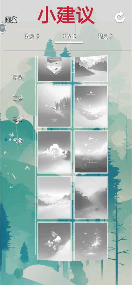 游戏BUG反馈,试了几次都会卡住。在主页唤灵次数为0时,点击“环保卡”,直接点击“返回”到主页面,再点击下方“唤灵”,此时弹出提示次数为0,但提示不会消失,直接卡住,音乐不会停止,但是无法在进行任何互动,只能杀后台强退。游戏为大佬个人制作的、刚上线的、轻音乐类休闲游戏。主要以收集知识卡牌和背景纯音乐为主。🎶音乐很好听,我的是悠悠山林。听着山林中的鸟兽虫鸣,似一把钥匙,开启童年回忆,仿佛回