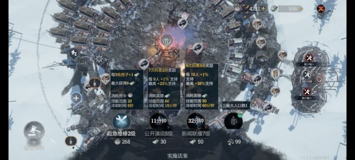 #冰汽时代测试 内服药游戏里是根本就没有这个东西吗(图1),然后法令点出人口普查以后,所有的法令都不能用了,人口普查法令直接就是连cd什么的都不显示(图二),而且到了48级满经验差一点,这一点怎么样也不给,造建筑,完成小人任务都不升级,硬卡关吗(图三)
