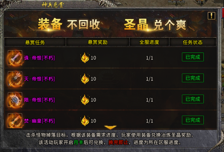 【龙城秘境-重返冰雪2019】经典单职业战士服,怀旧爆率拉满,纯靠打怪,装备全靠打,公平无套路,老玩家们快来体检吧~全服无限悬赏回收,一转装备起就能参与,装备保值无忧,材料全靠打怪掉落,首饰3合1、武器10合1,等级越高福利越丰富,斗笠、盾牌、宝珠特殊装备,品级越高属性越强,战力稳步提升。沙巴克城战焕新,获胜方限时城主称号+专属时装+成员称号,全阵营7天属性加成,重温沙城荣耀!#11月新游戏