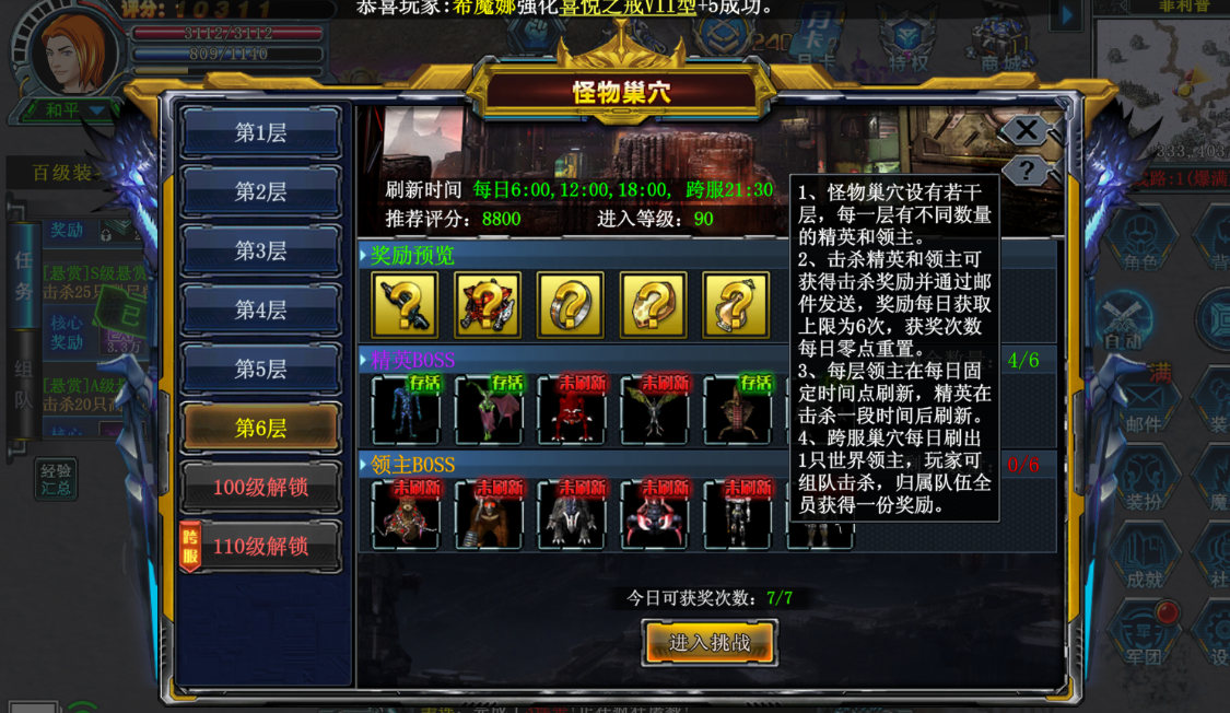 在《决战破晓》的末日战场中,怪物巢穴是无可争议的“装备圣殿”——这里不仅是新手积累过渡装备的试炼场,更是高手争夺S级金装与传奇碎片的核心战场。每日仅有的6次挑战机会,藏着战力跃迁的关键密码。本文将结合实战数据与职业特性,从基础规则到高阶技巧全面拆解,让你每一次入场都能满载而归。 01基本介绍Hot玩家等级达到40级即可解锁第一层巢穴,此后每提升10级开放下一层级,层级越高,奖励品质越卓越。