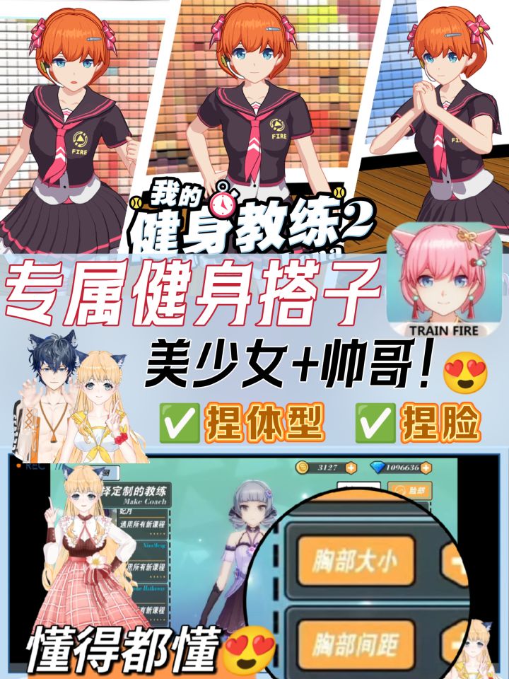 🌈3D二次元健身应用🎁定制你的美少女or帅哥❗😍还可以自由捏体型❗捏脸❗💡懂得都懂✅健身课程指导❗全是干货❗💡跟做模式❗💡互动模式❗重力感应✨✅时刻督促你健身✅养成激励💡成为你的健身动力❗💡我们可以通过健身来解锁游戏里的不同教练、服装和课程✅打破次元壁💡3D卡通渲染、高模换装、捏人捏脸、物理抖动、自动口型、自动眨眼、表情编辑等等应有尽有❗✌强烈推荐❗❗简直就是宝藏啊❗❗✌