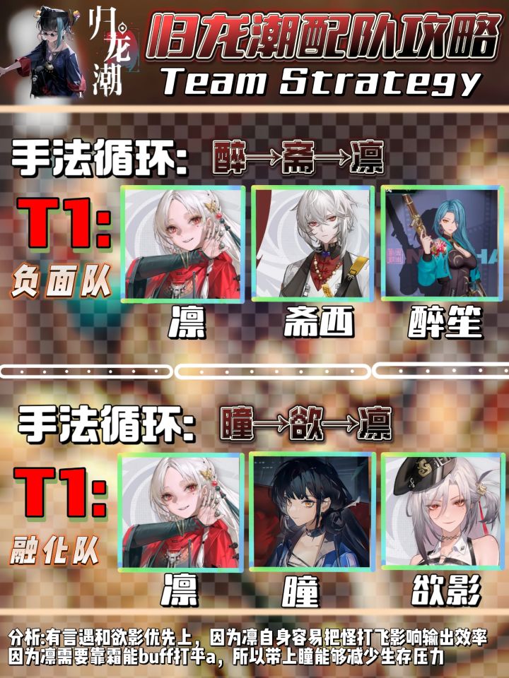 归龙潮配队推荐及思路1️⃣尘欲体系:欲影的顶级聚怪,搭配尘(潮品记得叠防御)破韧效率和伤害高的同时,同时弥补了手短的缺陷(一命尘推荐操作手法111aaa)实测这样能伤害最大化,配锁伤害高,配瑶瑶手感好(伤害差距在5-15之间)2️⃣平民锁:本期up角色,强度奇高,配尘欲造价高,平民现阶段配对困难怎么办?欲影→言预:4星高命差距不会太大(聚怪)尘→瞳:缺点就是伤害低一点,但是生存环境好,