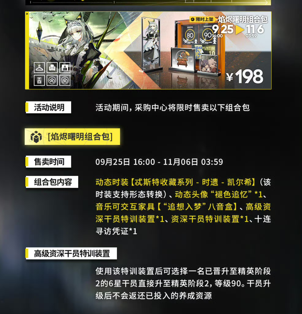 明日方舟又有新惊喜!9月25日16点至11月06日4点 ,[焰烬曙明组合包]限时上架。 这次组合包内容超丰富,其中最吸睛的当属动态时装【忒斯特收藏系列 - 时遗 - 凯尔希】,不仅是女仆装,还支持形态转换,双动态设计让凯尔希的新形象更加灵动。此外,组合包还包含动态头像“褪色追忆”1,能为你的个人界面增添独特风格;音乐可交互家具【“追想入梦”八音盒】,带来美妙的音乐体验;高级资深干员特训装置 1