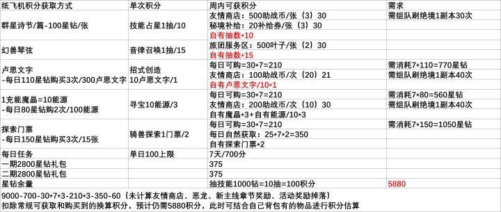 今日首日开服的几个区都达到了80级1转,纸飞机活动如约上线。平民玩家可结合自有资源估算自己仍需的积分资源后,使用掉一部分,留够二期纸飞机资源即可。①按一期纸飞机玩法计算,只需3轮9000积分的900纸飞机+免费礼包的5纸飞机,便可拿到第5层奖励②若打算玩第一期纸飞机且用掉每日可购资源,扣除常规可获取和购买到的换算积分,预计仍需5880积分,此时可结合自己背包有的物品进行积分估算④若从第8日