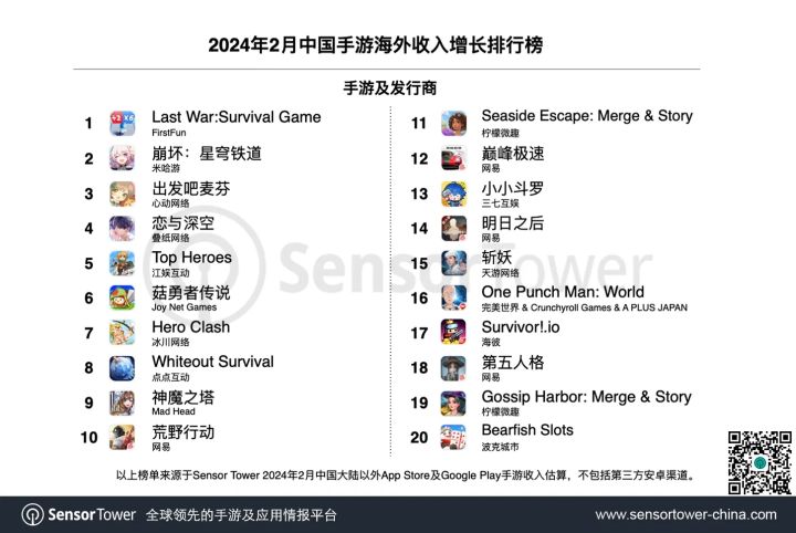 Sensor Tower商店情报平台最新数据显示,2024年2月中国手游产品在海外市场收入及下载量排行榜,详细榜单变化如下。(特别说明:本报告仅统计应⽤商店IAP预估值,不包括⼴告变现收⼊和中国地区第三方安卓渠道收入。)2月,点点互动《寒霜启示录》(Whiteout Survival) 推出一周年庆典活动「1st Anniversary Video Contest」,同时随着「Lunar New