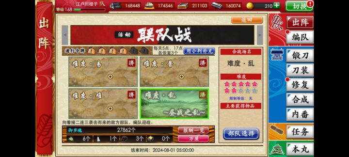本帖子为刀乱萌新的第一次三倍经验7-1练级记录帖一个人肝刀总觉得有点淡淡的孤单,遂开新号记录一下新人婶婶的肝刀日常。欢迎各位前辈和同事前来聊天~本人是刚刚入坑几个星期的萌新,没赶上新婶婶送三日月和小判的活动,因此很尴尬——小判不够且e3无法一队打通,于是决定联队战只拉到15万拿满修行道具,在e2打完每日的分数后直接无缝7-1练级。随贴附赠自制的本次联队战15w的咸鱼表,因为网上好像只有10w