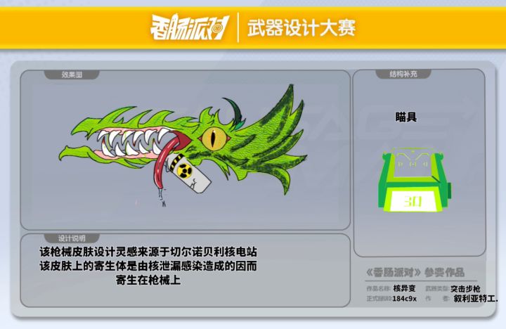 #香肠派对第三届设计大赛 #创作 #香肠派对 【武器类型】:突击步枪【设计灵感】:武器设计灵感来源于切尔诺贝利核电站【正式服ID】:184c9c【作者】:叙利亚特工.