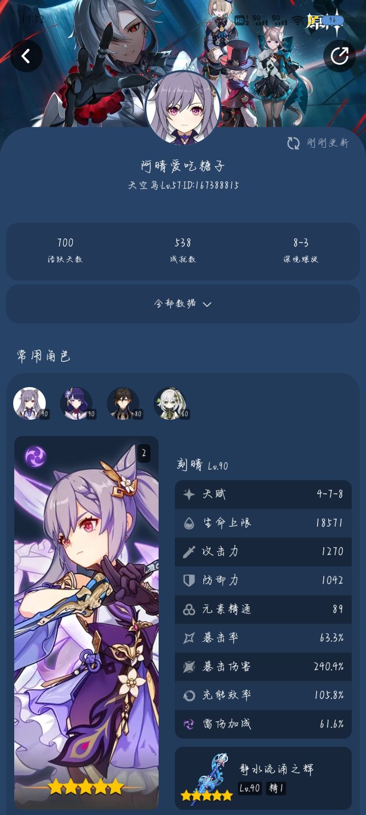 来点激化刻晴雷伤杯没刷出来用的攻击杯也没有好的暴击头武器匣里天赋6-8-8皇女面板也烂带的绝弦就万叶千精达标。还凑合科莱没带圣遗物只是秀一下给妮露配队的那套武器终末【歪出来的】#我的原神罐装知识#刻晴站起来了#草元素