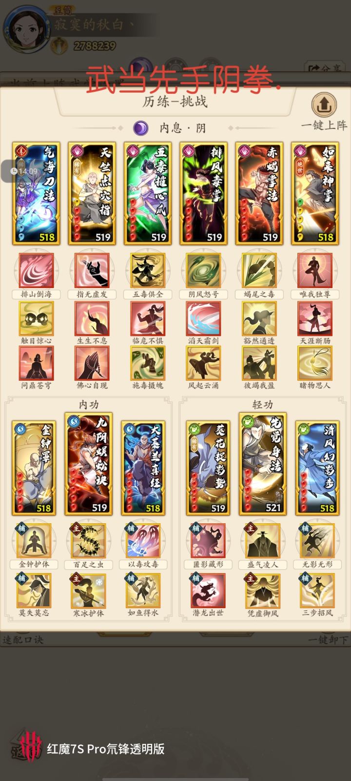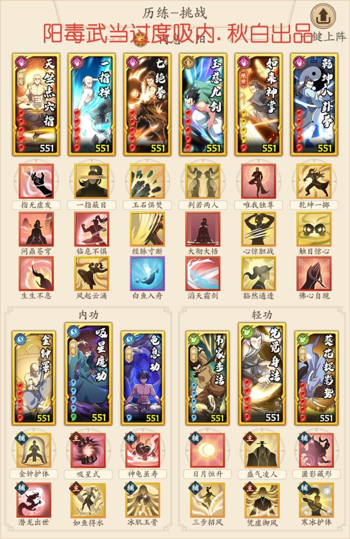 我是秋白,需要看更多攻略配招或查询配招可点击进入我个人主页慢慢翻找,也可+我VX:qiubai1177 进入拳修交流群取经. 接:拳号的调号配招爬塔新区氪金规划可+VX:qiubai1177因很多跟着我玩众生平等拳入坑的玩家没有前期可以用的配招,故此我自己发布一版前期过渡使用.(只适用于众生平等拳玩家过渡)配招如下:1.先手版过渡吸内思路微调注解:1.因众生平等拳玩家优先心愿轻功为先觉