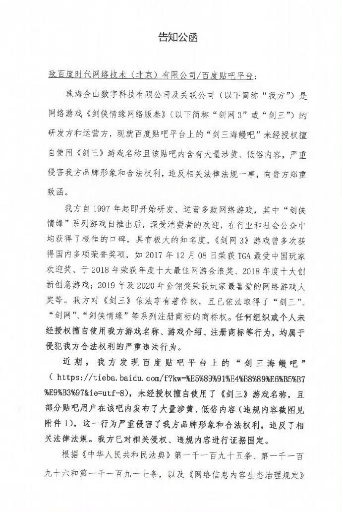 →百度贴吧里有一个——(剑三海鳗吧)据剑三称该吧存在涉黄低俗内容,并与2024年4月26日发函(图二-三)据说之前通过吧主联系过图四 5月9日百度回复论坛名不侵权+其他投诉链接并表示该渠道回复无法律效力— —于是剑三微博喊话百度贴吧最新消息据剑三微博评论称目前双方法务对接中#今天游戏圈发生了啥 #吃瓜爆料 #游戏资讯 #百度 #剑三