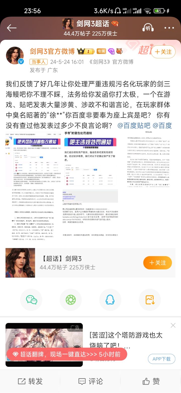 剑三微博喊话百度贴吧❗涉黄❗冷处理❗