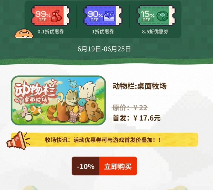 #动物栏桌面牧场 兄弟们,活动《动物栏:桌面牧场》在打九折的基础上,还能再分别打8.5折、1折、0.1折!有机会0.18直接拿下!唯一可惜的是:不是steam端激活的。感兴趣的兄弟们,抓紧冲吧ദ്ദി˶˃ ᵕ ˂ )✧