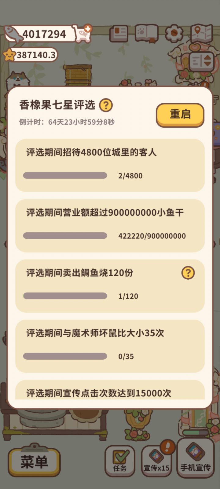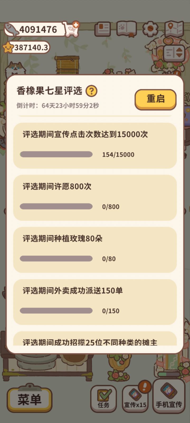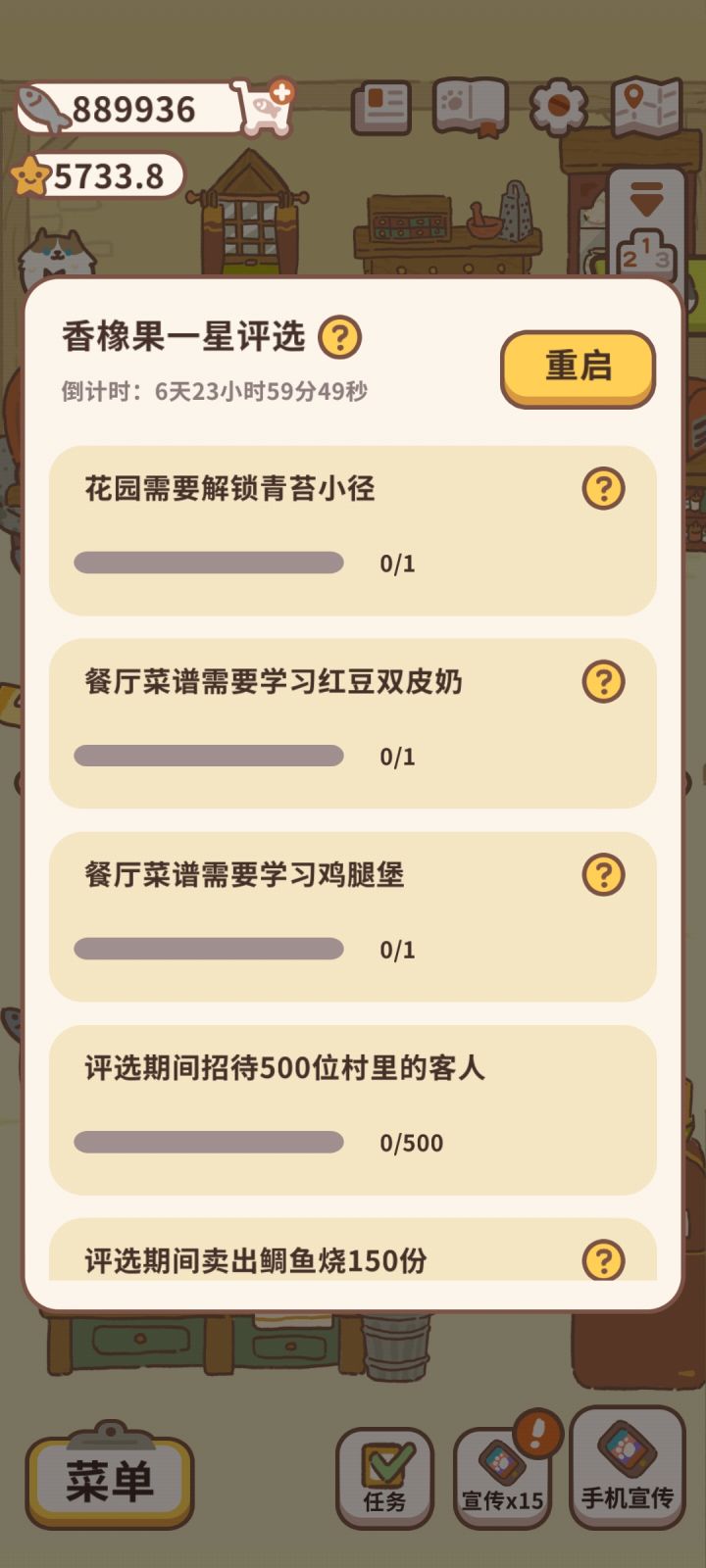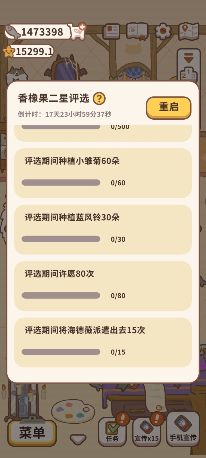 一星任务中比较难的是村里客人,可以在花瓶里放低级的小雏菊,比较玄学的方法是用最初的那一套的家具(不会影响收益),如果有人还没升级城里宣传那可以先不升,等做完了再升二星中比较难的是许愿80次,所以建议把能买的许愿池都买了,如愿望小泉,河神池,贝斯特池,然后大概看4-8个广告就行。对于花朵种植要求,如果时间不够了可以选择去种低级的花朵也是可以的。升星要求中需要买的家具都比较贵,如果没买的话最后3-