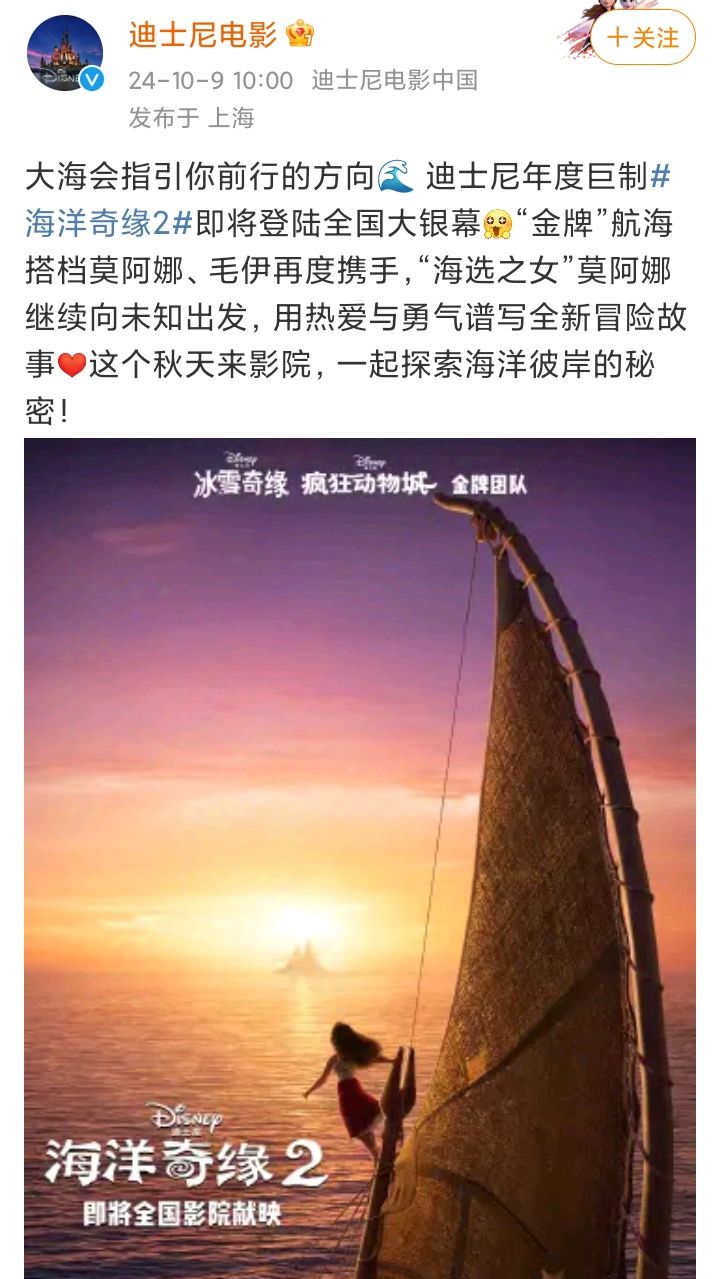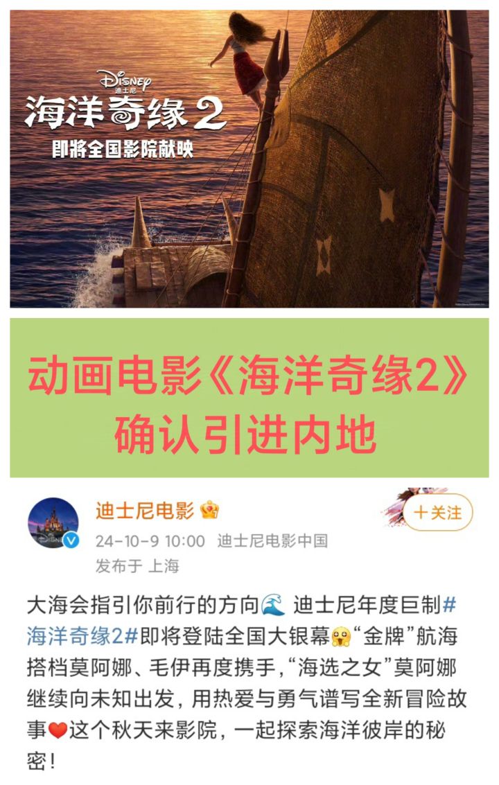 10/9号,迪士尼电影官方宣布,《海洋奇缘2》确认引进中国内地❗❗❗中国内地上映日期待定档,北美地区将于今年11月27日上映影片由小戴夫·德里克执导,奥丽伊·卡瓦洛、巨石强森回归配音,讲述莫阿娜意外收到寻路祖先们的呼唤,前往大洋洲的远海进行冒险的故事。 喜欢动画电影的朋友可以期待一下#今天