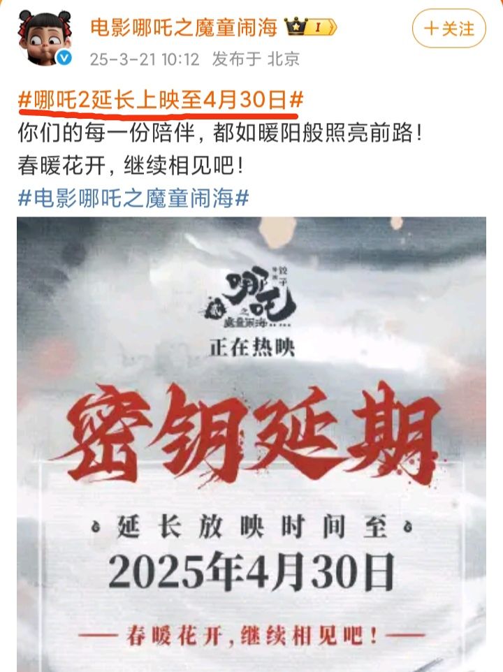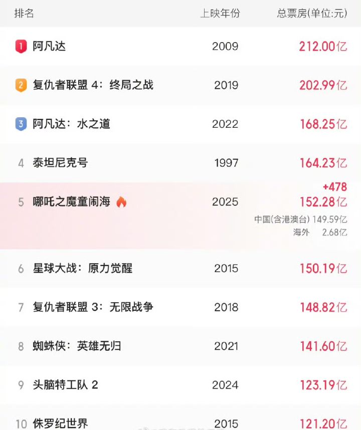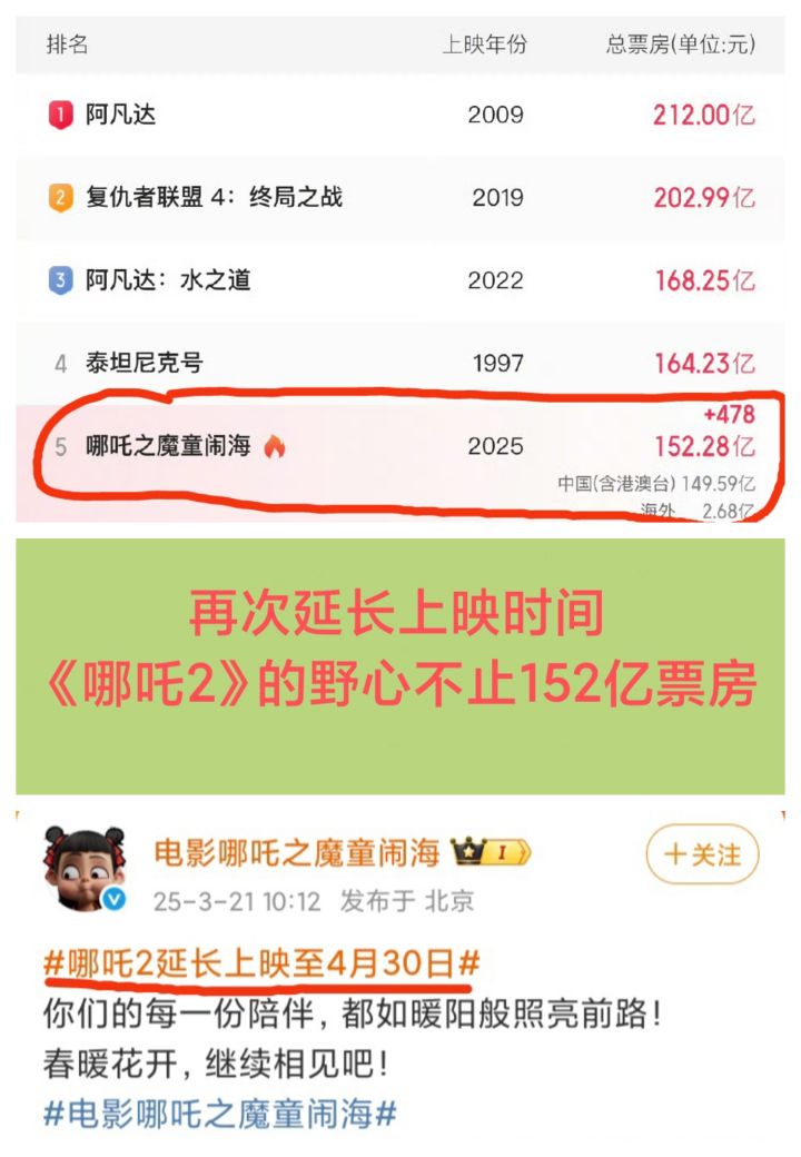 3/21号,《哪吒2》官方发文,宣布电影延长上映时间至4月30日❗❗❗就在今天,《哪吒之魔童闹海》全球票房突破了152亿元,全球第五名!其中,海外票房只有2.68亿,占比仅1.76%!官方还是想继续突破突破记录的,延长之后的票房数据能到哪个地步,谁也猜不到。搞不好就全球第4了当然,这已经不是第一次