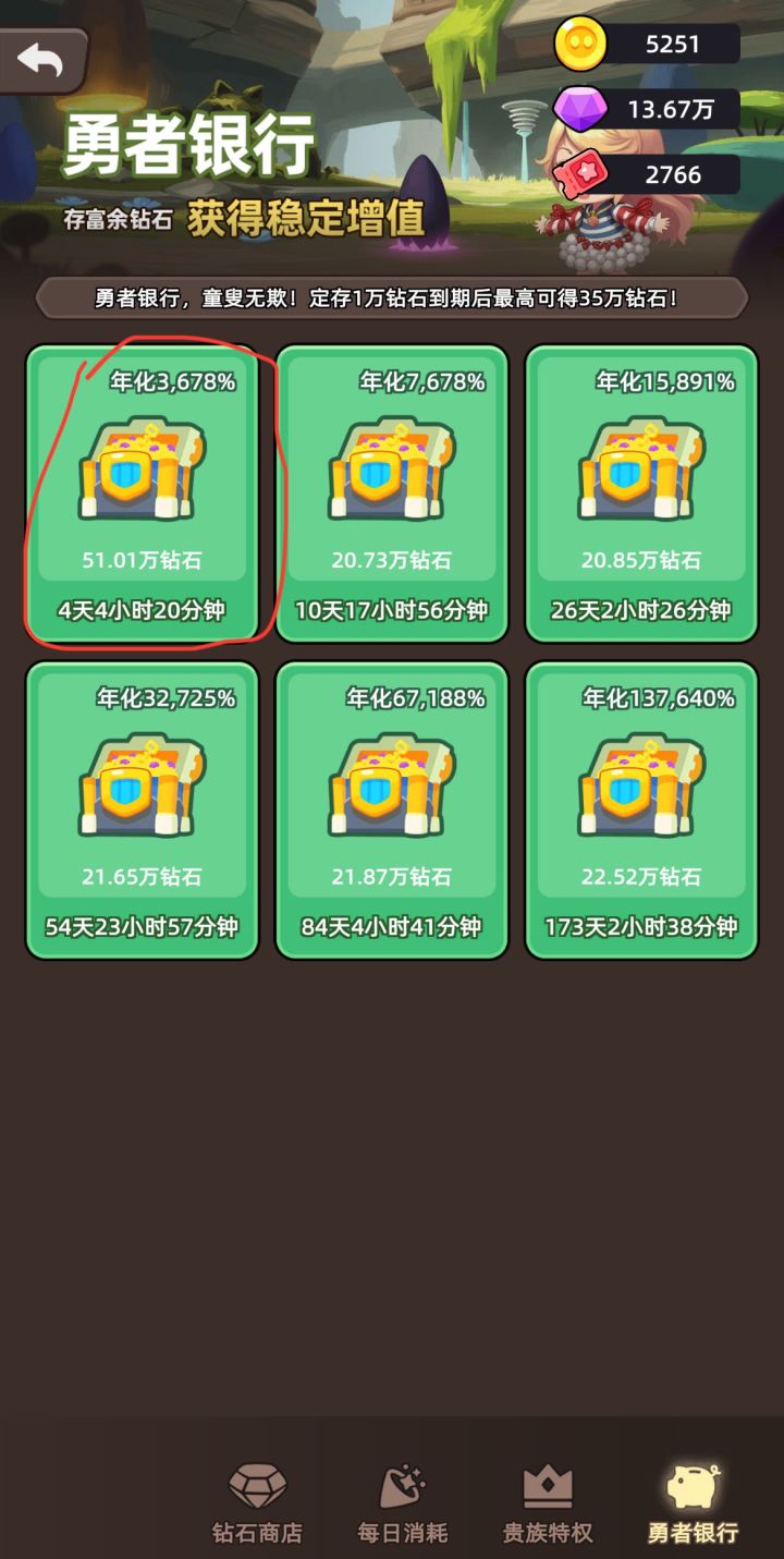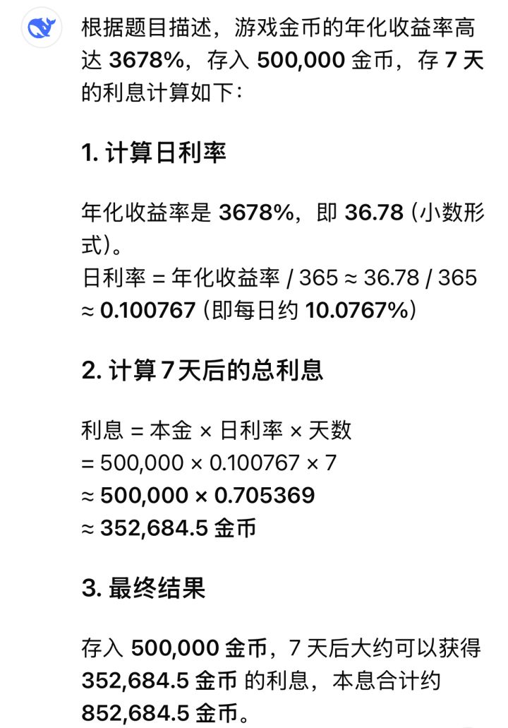 按照游戏里的勇者银行的7天3678%年化率,存7天50w钻石有35w利息,1天应该有5w收益,但实际上每天只有0.5w收益,差别10倍,所以这个年化率到底是哪个呢?其它的好像都一样,都差了10倍,有没有大佬解释下 #勇者不能停