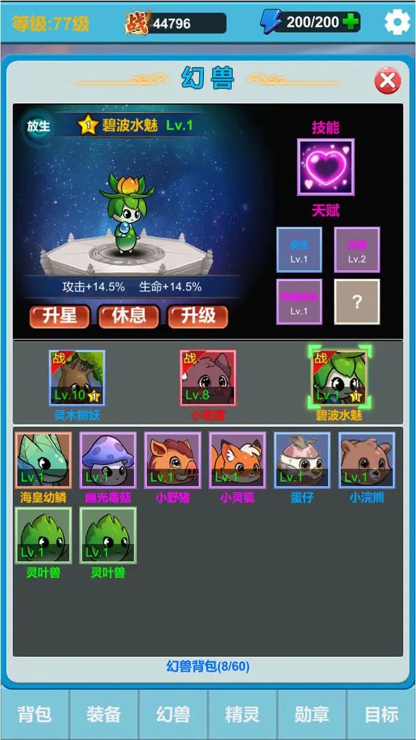 目前爬到51。个人觉得推图技能主要还是围绕绝技为主。选技能的时候首选绝技,怒气相关的技能,次选防御和生命。装备也是。幻兽技能是一级+2%,幻兽岛可以无限刷广告,所以存够200水晶只抓红色的。幻兽技能尽量选闪避,没有闪避黄色的就行。必须要上水泽仙子,因为冰冻非常好用。勋章顶级是红色,其他都可以分解。#勇者冒险之旅2