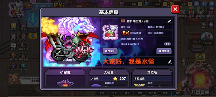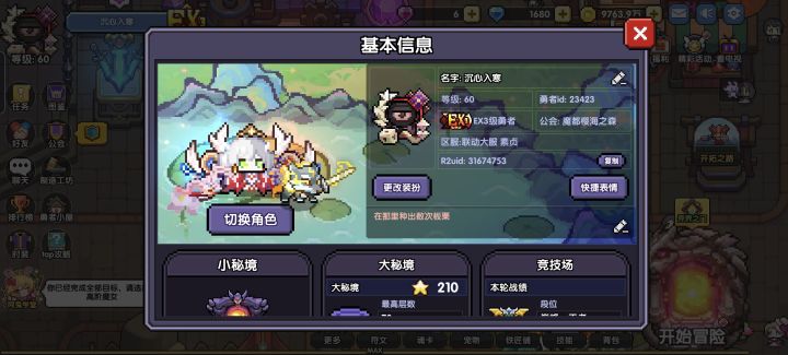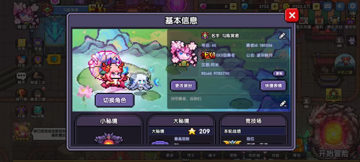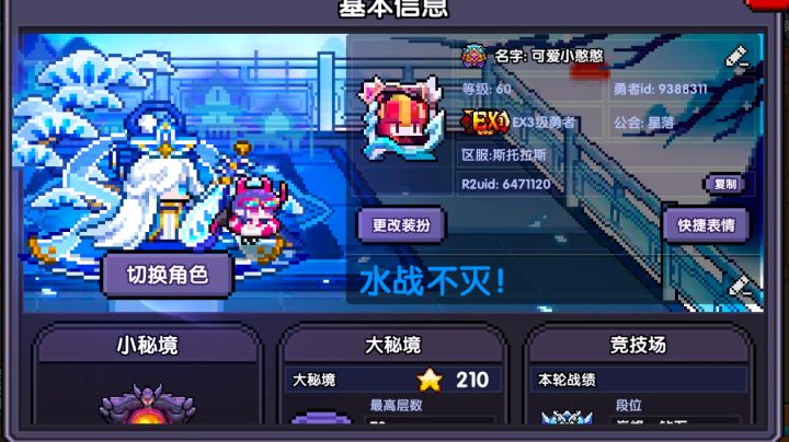 相遇——相知——相离——相和1.相遇:第一次是偶然在tap发现了这个像素游戏,吸引我的地方是像素的可爱画风。那时候我入职的第一个职业就是牧师,加入了一区斯托拉斯的自爆牧大军之中。那时的游戏刚起步,虽然规模小,但是每一处都能感觉到勇者团队的用心。2.相知:后来符文系统的推出,带来了翻天覆地的变化,也让游戏的可玩性大幅提升,那时每天卡体力刷能量,800,1200,1400,每一个能量就是一个大