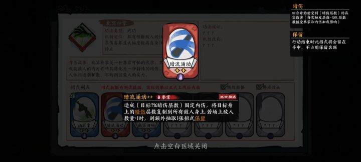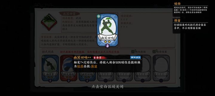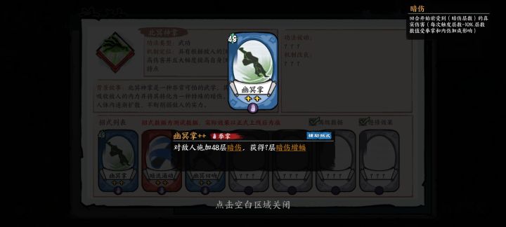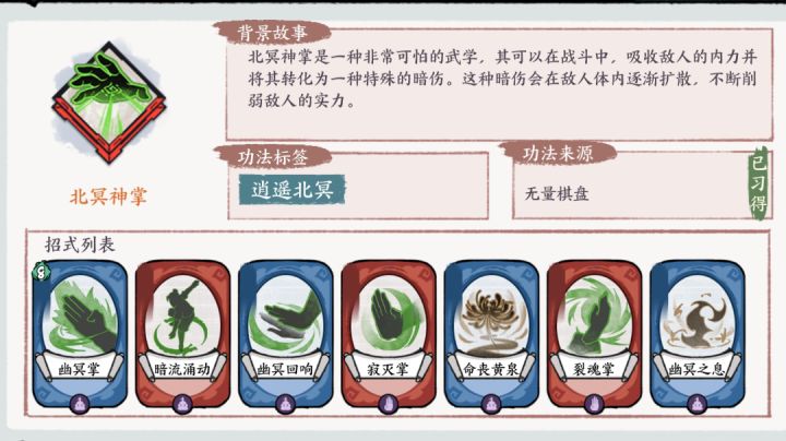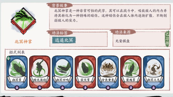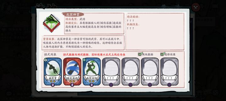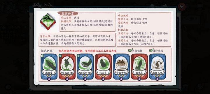 根据机制定位和背景做出以下猜测首先是对剩下4个招式的猜测招式1辅助招式:获得?护甲,增加当前?%的暗伤振幅的层数,并抽一张攻击招式。消耗?猜测有个招式效果就类似于宗门大比里北冥有一个每回合增加%当前暗伤增幅层数的效果,或者是类似于那些提高当前%臂力的招式的效果,与那些跟臂力有关的流派形成对比。招式2辅助招式:消耗?内力并获得两张会消耗的幽冥掌。没什么好说的,猜测应该有招式类似于折梅手