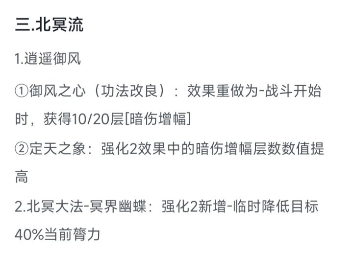 看到今天的北冥流的平衡性调整,我只想说策划是真的没玩过北冥。第一个御风之心直接重做成堪比黄色功法的效果,对比以前擂台打满14回合直接少了8层的暗伤振幅,如果对比以前打关卡没有回合限制可以说直接少了上百层暗伤振幅。不知道这么改有什么用,想用他抬新出的北冥神掌?,别搞笑了,如果出了之后用正常的北冥流派打擂台还是没折梅手好用打的高,那逍遥御风不仅没增强还削弱了,要调整不如调整一下那个逍遥