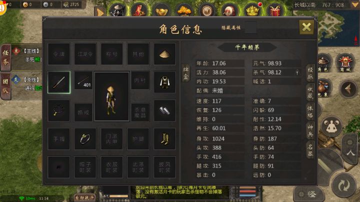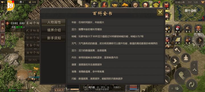 武侠是一个世界,更是一种精神《千年微变版》10月12日火热上线!庞大的地图、多元化的社交模式、上百种武学套路圆你一个武侠梦的同时让这世界多一些快乐,少一些仇怨与纷争、1.人物属性年龄:在线时间越长,年龄越大活力: 随着年龄的增长而增加呐喊: 玩家年龄大于30并活力值超过50将解锁呐喊功能,呐喊分为7级元气:元气是练武的数值,武功练到满级可以提升性能,数值的高低都是影响境界的活力