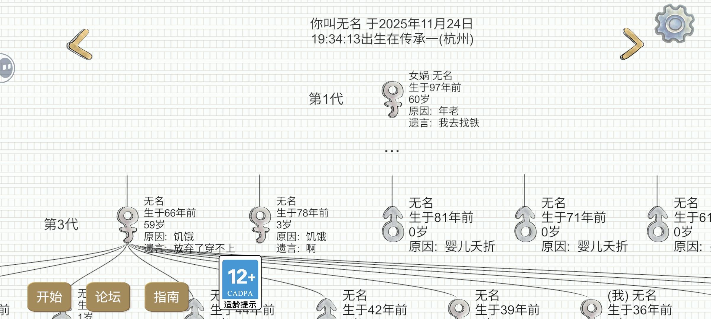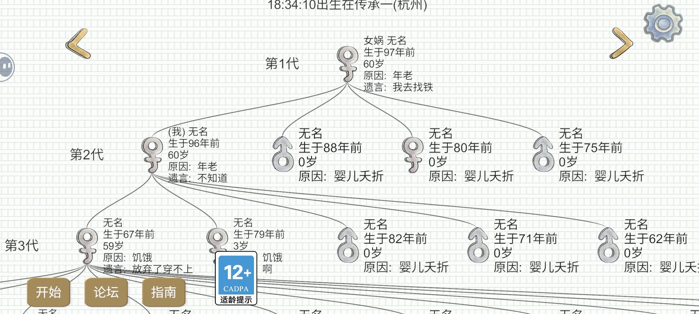 离谱大事件,开荒养了个娃,说要去找铁,我说你还太小了,长大再去,她说能吃东西了,非要去,我把海豹皮和包都给她,又塞了几个烤兔子,让她注意安全。等我和女娲把马车都做出来了也没回来。一看家谱人都三十了还活着。后面我噶了。结果投到我女儿了,她已经建上家里,后面我又回女娲家,但是没找到她。上面图片上是她想要传承下去,但是没有有一个人活。什么人啊,图什么#华夏人生拆家