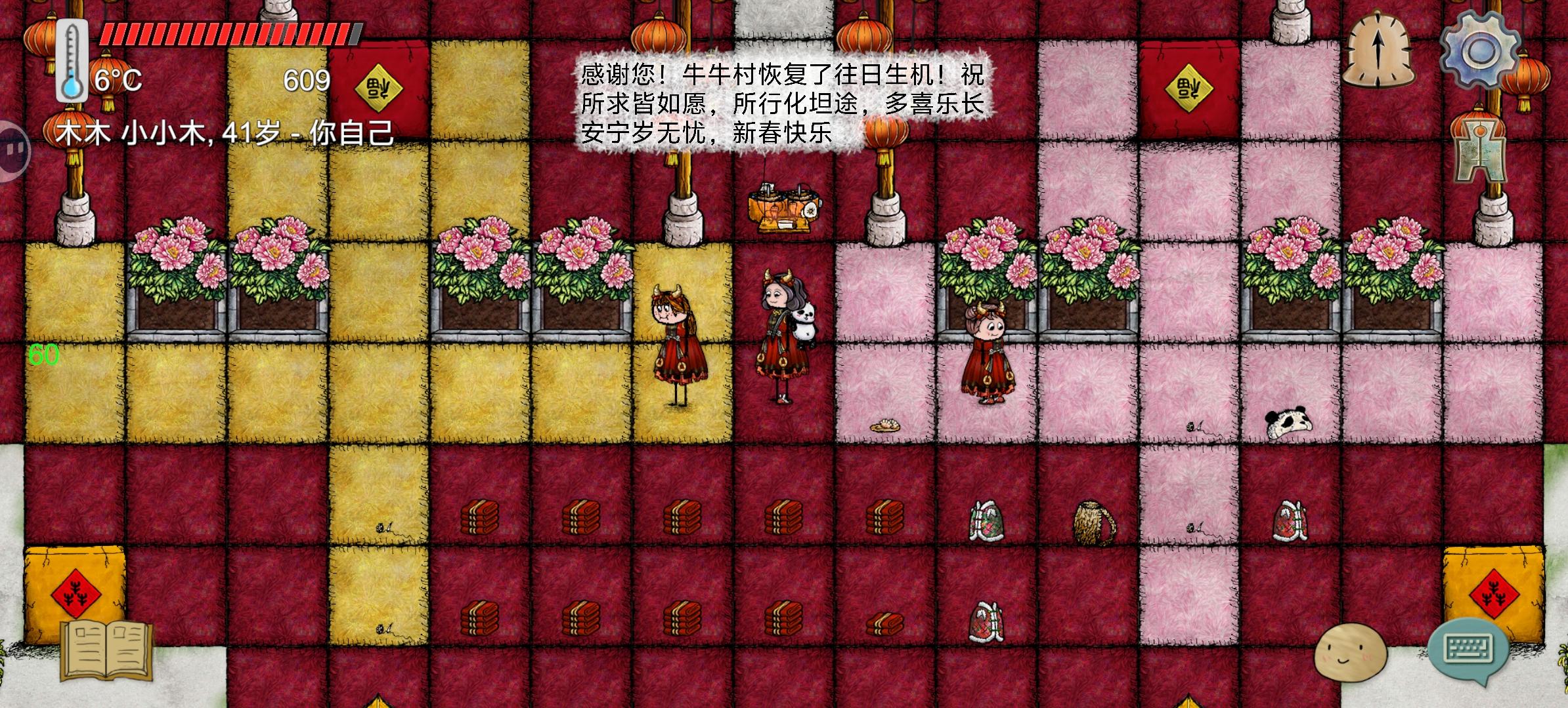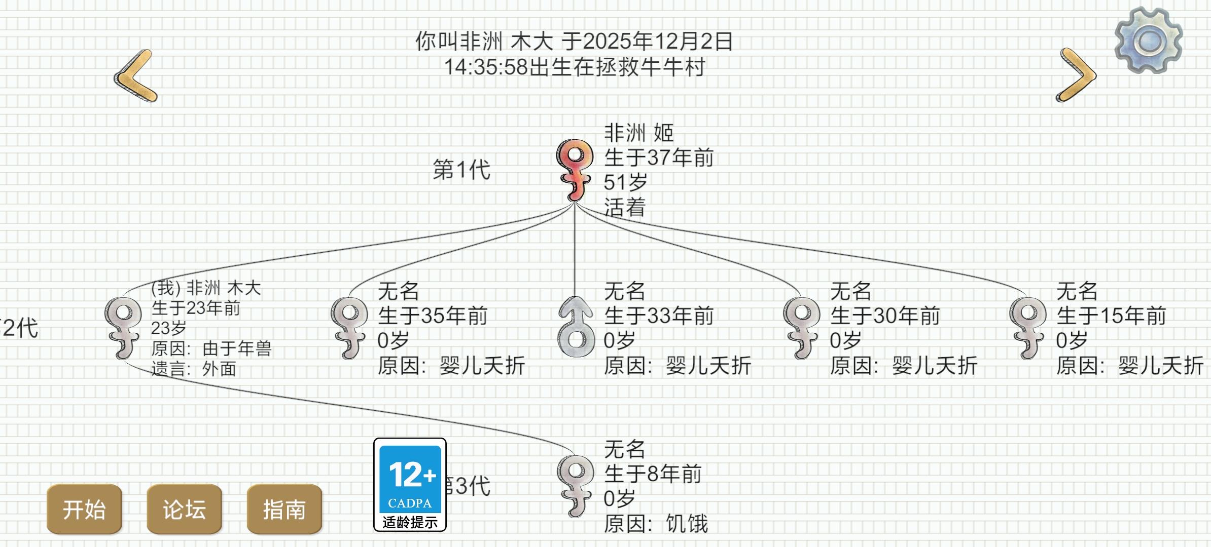 #华夏人生牛牛村 在非洲姬这里玩,我是大女儿木木,然后生了个香香软软小蛋糕,小蛋糕的儿子无名,我和无名和女娲和小蛋糕四个人玩的挺开心,但是女娲有点不会,我和无名打年兽,发现无名被咬了,我去拿针线也被咬了,然后女娲救我俩去拿针线也被咬了,太难过了,女娲都57了嘎了